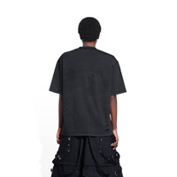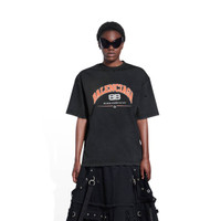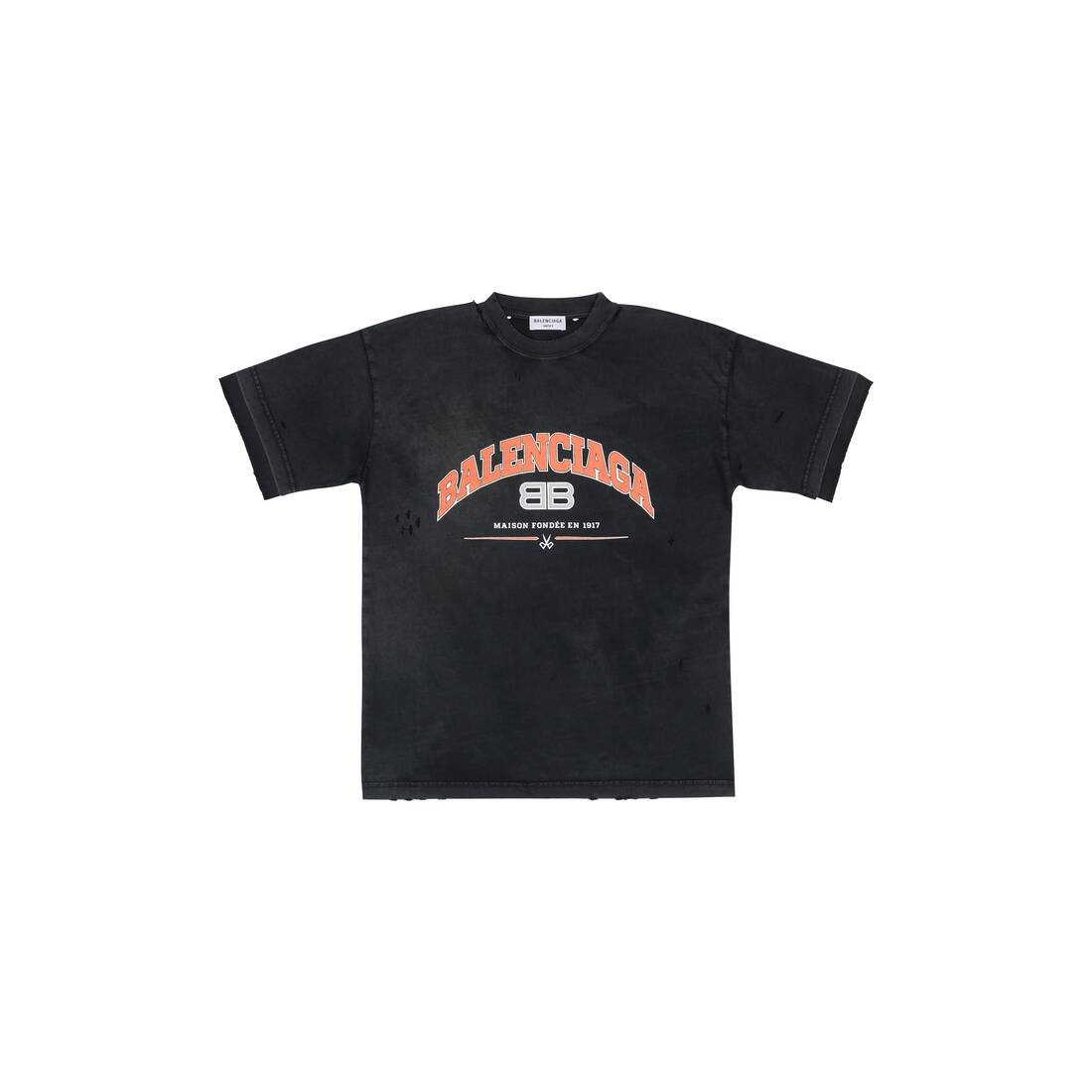 Maison Balenciaga T-shirt Medium Fit in black, orange and white vintage jersey PRODUCT DETAILS • Vintage jersey • Medium fit • Crewneck • Maison Balenciaga artwork printed at front • Rippings allover the fabric • Worn-out effect • Made in Portugal • Cold machine wash • Model is 178 cm / 5'83'' and is wearing a FR size S Material: 100% cotton