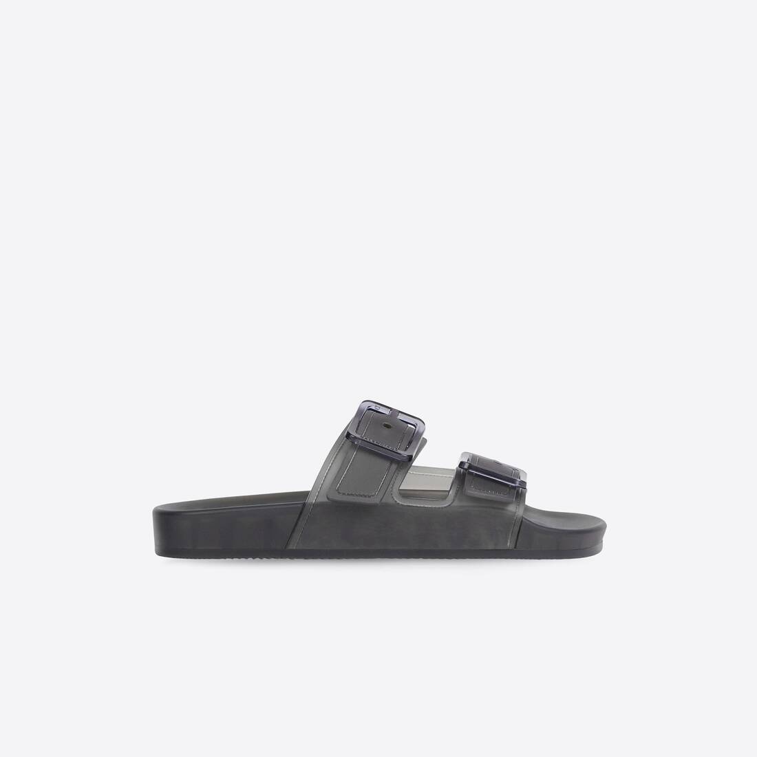 Mallorca Sandal in black clear technical polyurethane PRODUCT DETAILS • Clear polyurethane • Slide sandal • Two straps with two adjustable clear buckles • Molded footbeds • Balenciaga logo engraved on each buckle • Made in Italy • Wipe with a soft cloth Material: 100% polyurethane