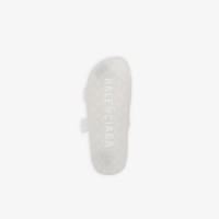 Mallorca Sandal in white clear technical polyurethane PRODUCT DETAILS • Clear polyurethane • Slide sandal • Two straps with two adjustable clear buckles • Molded footbeds • Balenciaga logo engraved on each buckle • Made in Italy • Wipe with a soft cloth Material: 100% polyurethane