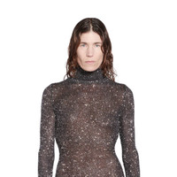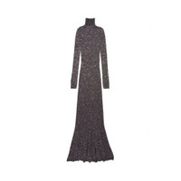 Maxi Dress in black and silver shiny sequined viscose knit PRODUCT DETAILS • Shiny sequined viscose knit • Fitted • High neck • Long sleeves • Ribbed trims • Flared hem • Maxi length • Made in Italy • Dry cleaning • Model is 177 cm / 5'10" and is wearing a size S Material: 55% polyamide, 45% metallized fiber