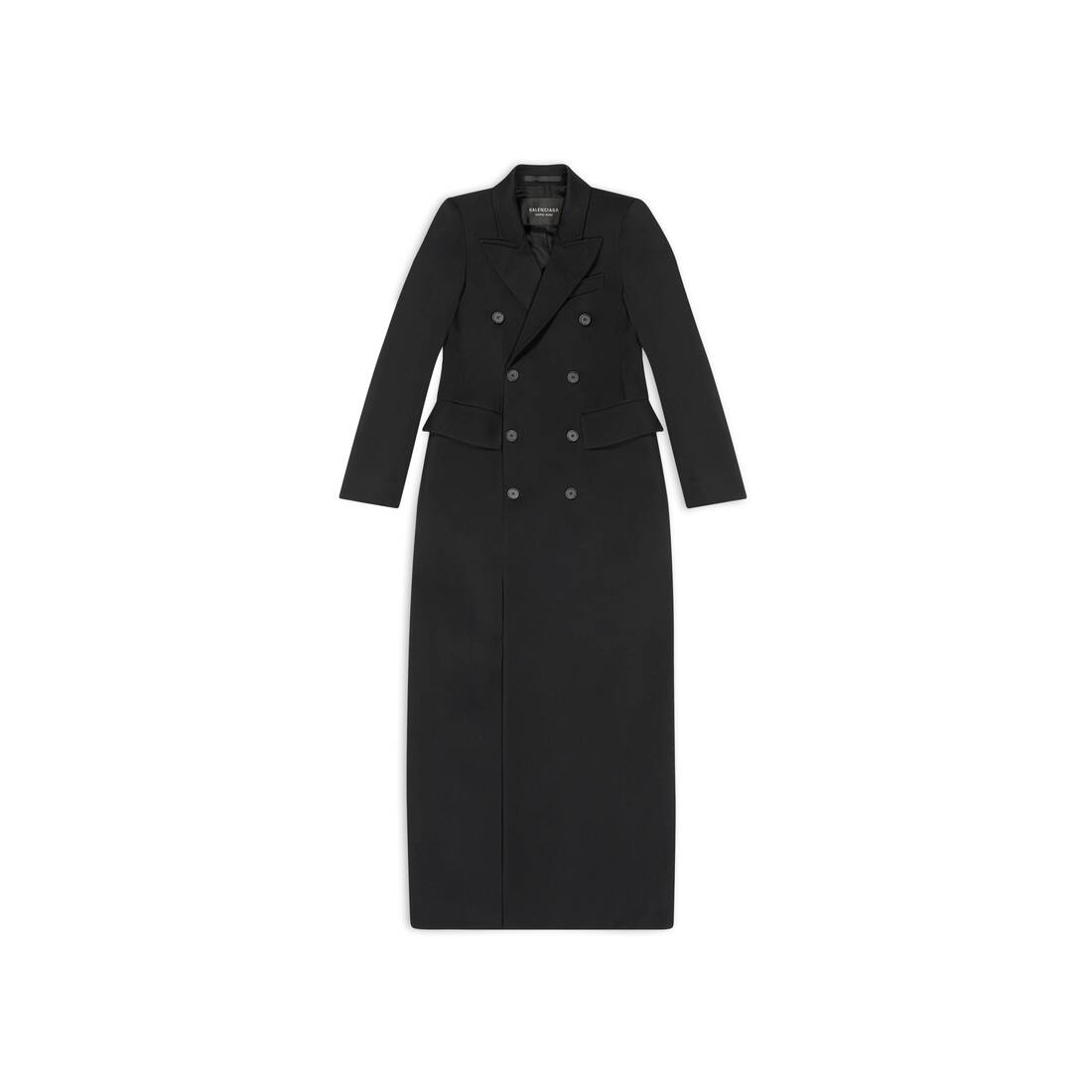 Maxi Hourglass Coat in black dry wool gabardine is from the look 1 of the Balenciaga's Spring 23 Collection, NYC Show. PRODUCT DETAILS • Dry wool gabardine • Hourglass fit • Peak lapel • 8 buttons double-breasted at front • 1 piped pocket at chest • 4 buttons at cuffs • 2 flap pockets at front • 1 vent at back • Ankle length • Made in Italy • Dry cleaning • Model is 177 cm / 5'10'' and is wearing a FR size 36 Material: 100% virgin wool