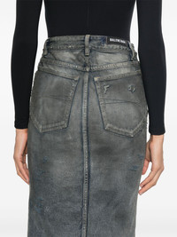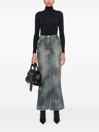 distressed denim maxi skirt Balenciaga gives a refresh to the classic denim skirt as seen in this garment from the AW23 collection. Crafted from pure cotton, the maxi silhouette is elevated by its dirty effect that lends the garment a love-worn finish. Highlights - Indigo blue - Cotton - Distressed effect - Ripped detailing - Logo patch to the rear - Mid-rise - Concealed fly and button fastening - Belt loops - Classic five pockets - Front slit - Unlined - Straight hem - Maxi Imported Composition Outer: Cotton 100% Lining: Cotton 100% SIZE & FIT Model measurements Height 5 ft 10 in(1.78 m) Bust/Chest 33.07 in(84 cm) Hips 36.61 in(93 cm) Waist 24.8 in(63 cm) Measurement HIPS 33.85 in(86 cm) LENGTH 41.73 in(106 cm) WAIST 27.55 in(70 cm) FittingInformation This maxi-length skirt is intended to be worn just below the waist Sturdy and hard-wearing, this denim piece offers no stretch This piece fits true to size – take your usual size Washing instructions Machine Wash