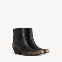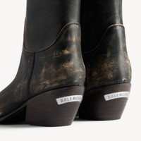 Memphis Bootie in black and beige worn out bullskin PRODUCT DETAILS • Worn out bullskin • Bootie • Semi square toe • 55mm arch • Beveled heel • Inner zipped closure • Balenciaga logo debossed on the exterior • Metal plate at back of the heel • Made in Italy Upper: bullskin - Sole: calfskin, TPU - Insole: calfskin