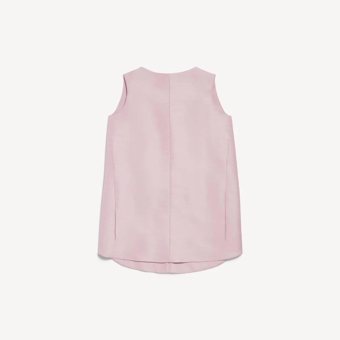 Mini Sack Dress in dusty pink wool and silk blend PRODUCT DETAILS • Silk and wool blend • Sack-inspired mini dress • Crewneck • Front dart • Rounded back cut-outs • 2 side pockets • Invisible back zip closure • Made in Italy Main material: 80% wool, 20% silk