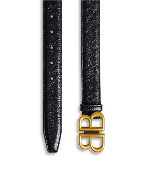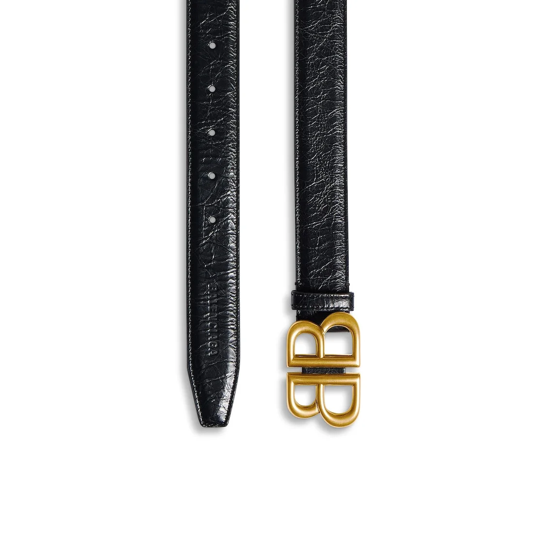 Monaco Belt in black Arena calfskin, aged-gold hardware PRODUCT DETAILS • Dimensions: Width: 1,2 inch • Arena calfskin • Balenciaga logo embossed tone-on-tone at end tip • Aged-gold BB logo hardware • 20 notches on the belt • Tone-on-tone leather loop • Made in Italy • Wipe with a soft cloth Material: 100% calfskin