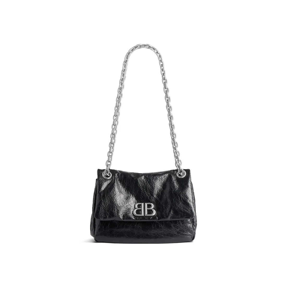 Monaco Mini Bag in black Arena calfskin, aged-silver hardware PRODUCT DETAILS • Dimensions: L9,8 x H8,7 x W4,7 inch • Arena calfskin • Shoulder chain strap (drop: 10,2 inch) • Magnet flap closure • Aged-silver Monaco BB logo hardware • Side snaps • 1 pocket at front • 1 inner zipped pocket • Nylon lining • Made in Italy Material: calfskin
