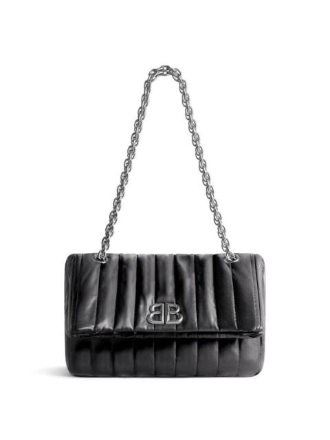 Monaco Small Chain Bag in black Arena calfskin, aged-gold hardware PRODUCT DETAILS • Dimensions: L11 x H7,1 x W3,9 inch • Arena calfskin • Shoulder chain strap (drop: 8,8 inch) • Aged-gold BB logo hardware • Flap closure • 1 pocket at front • 1 inner patch pocket • Cotton canvas lining • Made in Italy • Wipe with a soft cloth Material: 100% calfskin