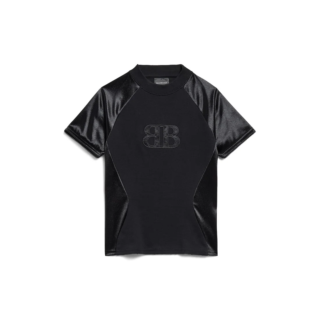 Nano BB Fitted Top in black interlock stretch jersey for Women PRODUCT DETAILS • 2 different fabric, 1 cotton jersey and 1 shiny fabric • Crewneck • Short sleeves • Nano BB artwork embroidered at front • Made in Portugal Main material 1: 100% cotton