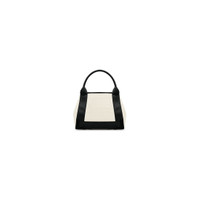 Navy XS Cabas in light beige cotton canvas and black calfskin PRODUCT DETAILS • Dimensions : L12,6 x H7,8 x W2,9 inch • Cotton canvas and calfskin • Cabas • Two handles • Removable shoulder strap (21,2 inch) • Balenciaga logo printed at front • Semi-shiny palladium hardware • Open top • 1 Inner zipped pocket and detachable pouch • Side snaps • Made in Italy • Wipe with a soft cloth Material: 80% cotton, 15% calfskin, 5% viscose