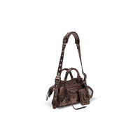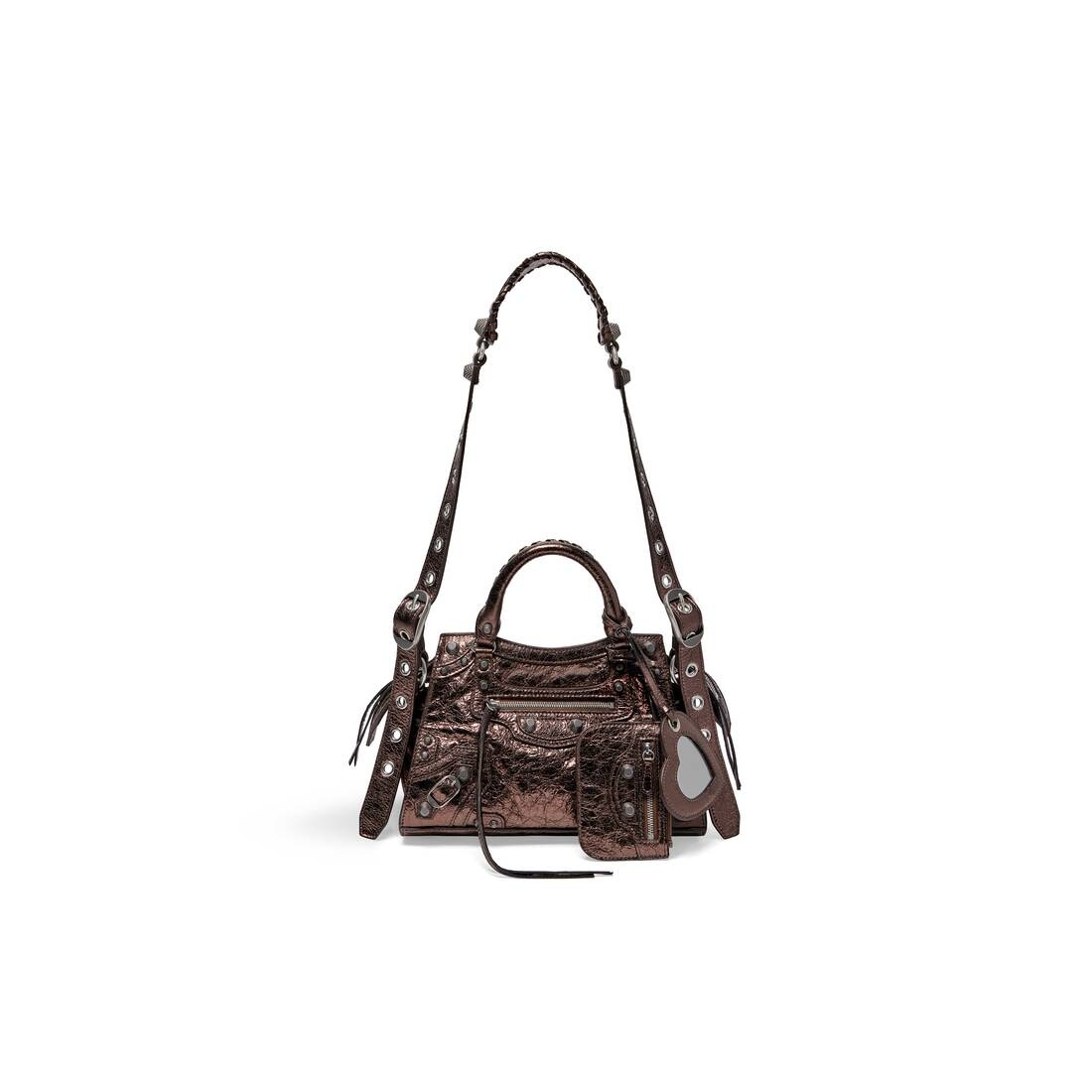 Neo Cagole XS Handbag in brown metallized Arena lambskin, aged-silver hardware PRODUCT DETAILS • Dimensions: L10,2 x H7 x W4,5 inch • Metallized Arena lambskin • Trapezoidal shape • Two leather hand-braided handles • Adjustable and removable strap (19,6 inch) • Aged-silver hardware • Zipped closure with knotted leather puller • Front zipped pocket with knotted leather puller • 1 inner zipped pocket • 1 removable zipped pouch • 1 removable heart mirror • Tone-on-tone Balenciaga logo embossed on mirror • Cotton canvas lining • Made in Italy • Wipe with a soft cloth Material: 100% lambskin