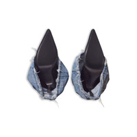 New flex 90mm Over-The-Knee Boot in black knit and light blue denim is from look 20 of Balenciaga Summer 25 Collection. PRODUCT DETAILS • Cotton • Over-the-knee boot • Worn-out effect • Pointed toe • 90mm arch • Flex heel • Hollowed out design at front • Black lacquered heel • Black sole • Made in Italy Upper: cotton - Sole: calfskin - Insole: goatskin