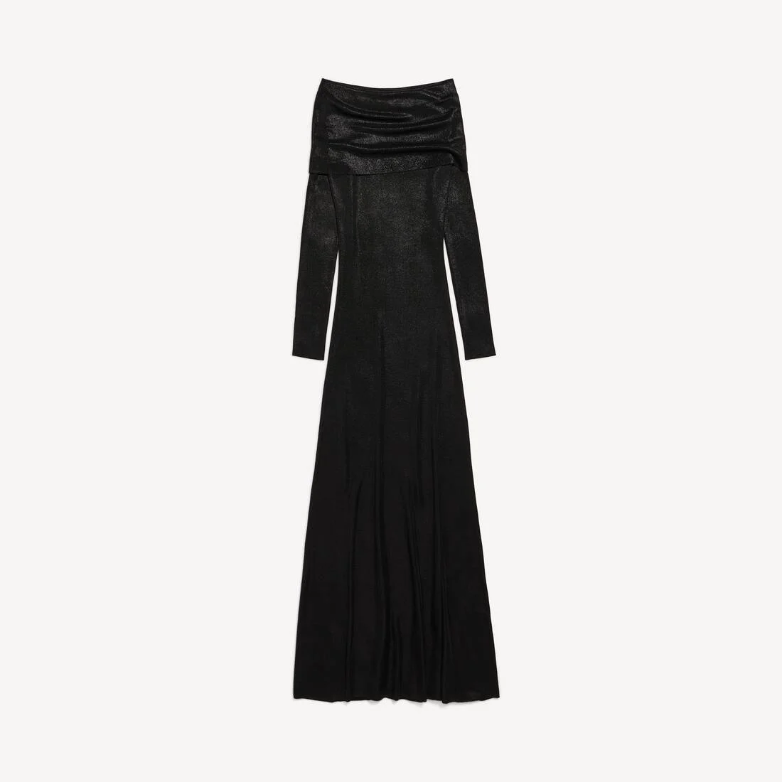 Off-Shoulder Maxi Dress in black viscose metallic foil knit for Women PRODUCT DETAILS • Viscose metallic foil knit • Off-shoulder neckline • Long sleeves • Made in Italy Main material: 96% viscose, 3% polyamide, 1% elastane