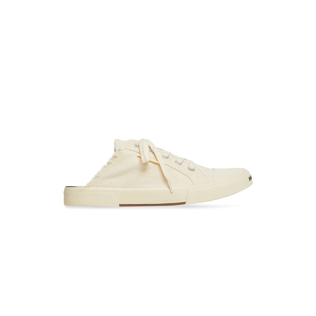 Paris Sneaker Mule in red destroyed knit and white rubber PRODUCT DETAILS • Destroyed cotton and rubber • Mule • Open at back • Balenciaga logo printed at the edge of the toe • Embossed size at back • 5 eyelets lace-up vamp • Vulcanized sole • Made in China • Wipe with a soft cloth Material: 100% cotton