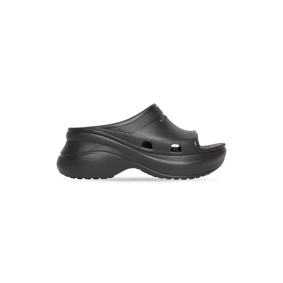 Pool Crocs™ Slide Sandal in black rubber PRODUCT DETAILS • Rubber • Slide sandal • Open toe • 5mm arch • Balenciaga logo debossed on the upper • Embossed size at back • Tone-on-tone sole and insole • Made in China • Crocs™ collaboration • Wipe with a soft cloth Material: 100% EVA