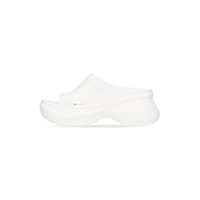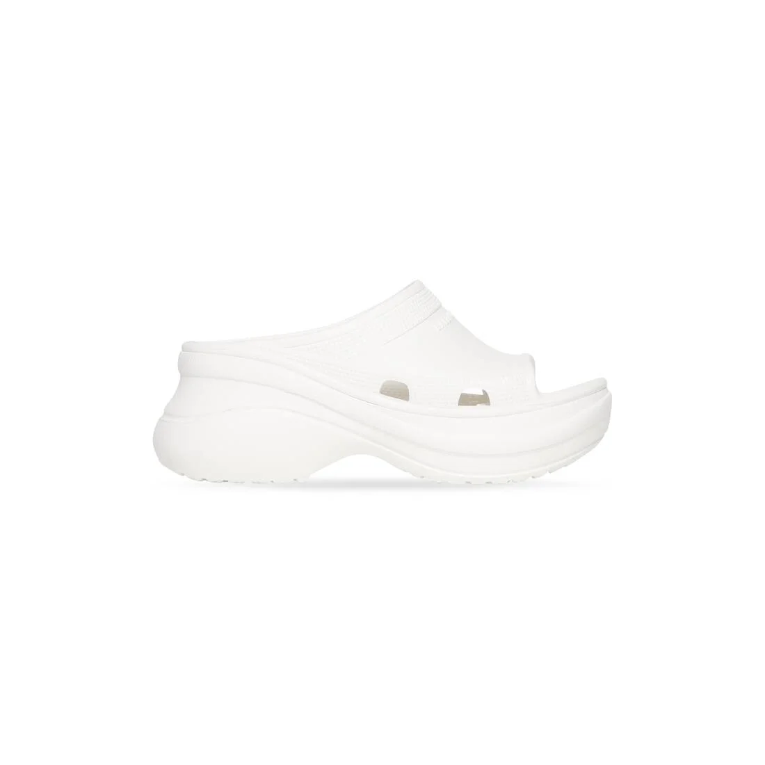 Pool Crocs™ Slide Sandal in white rubber PRODUCT DETAILS • Rubber • Slide sandal • Open toe • 5mm arch • Balenciaga logo debossed on the upper • Embossed size at back • Tone-on-tone sole and insole • Made in China • Crocs™ collaboration • Wipe with a soft cloth Material: 100% EVA