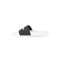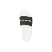 Pool Slide Sandal in white and black rubber PRODUCT DETAILS • Rubber • Slide Sandal • Molded rubber footbeds • 3D logo on the strap • Embossed Balenciaga logo on the sole part • Made in Italy • Wipe with a soft cloth Material: 100% rubber