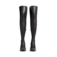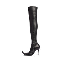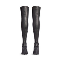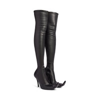 Poulaine 110mm Boot in black Nappa stretch goatskin is in several looks of Balenciaga Fall 25 Collection. PRODUCT DETAILS • Nappa stretch goatskin • Boot • Pointed toe • 110mm arch • BB logo incrusted at front • Hollowed out design at front • Inner zipped closure • Tone-on-tone covered heel • Black sole • Made in Italy Upper: goatskin - Sole: calfskin, stainless steel - Insole: lambskin