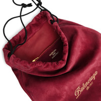 Purse Bag in cherry red waxed cachemire suede calfskin is from look 49 of Balenciaga Winter 25 Collection. PRODUCT DETAILS • Dimensions: L8,2 x H9,8 x W0,2 inch • Waxed cachemire suede calfskin • Purse • Balenciaga Est. 1917 logo laminated printed with gold foil • Shoulder and hand carry • Aged-gold hardware • Drawstring closure (drop: 6,3 inch) • 1 main compartment • 1 inner zipped pocket • Calfskin lining • Made in Italy Material: calfskin, viscose
