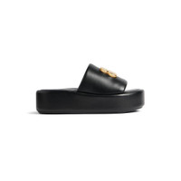 Rise Sandal in black shiny Nappa lambskin PRODUCT DETAILS • Shiny Nappa lambskin • Slide Sandal • Open rounded toe • Gold Monaco BB on the upper • Tone-on-tone sole • Made in Italy • Wipe with a soft cloth Material: 100% lambskin