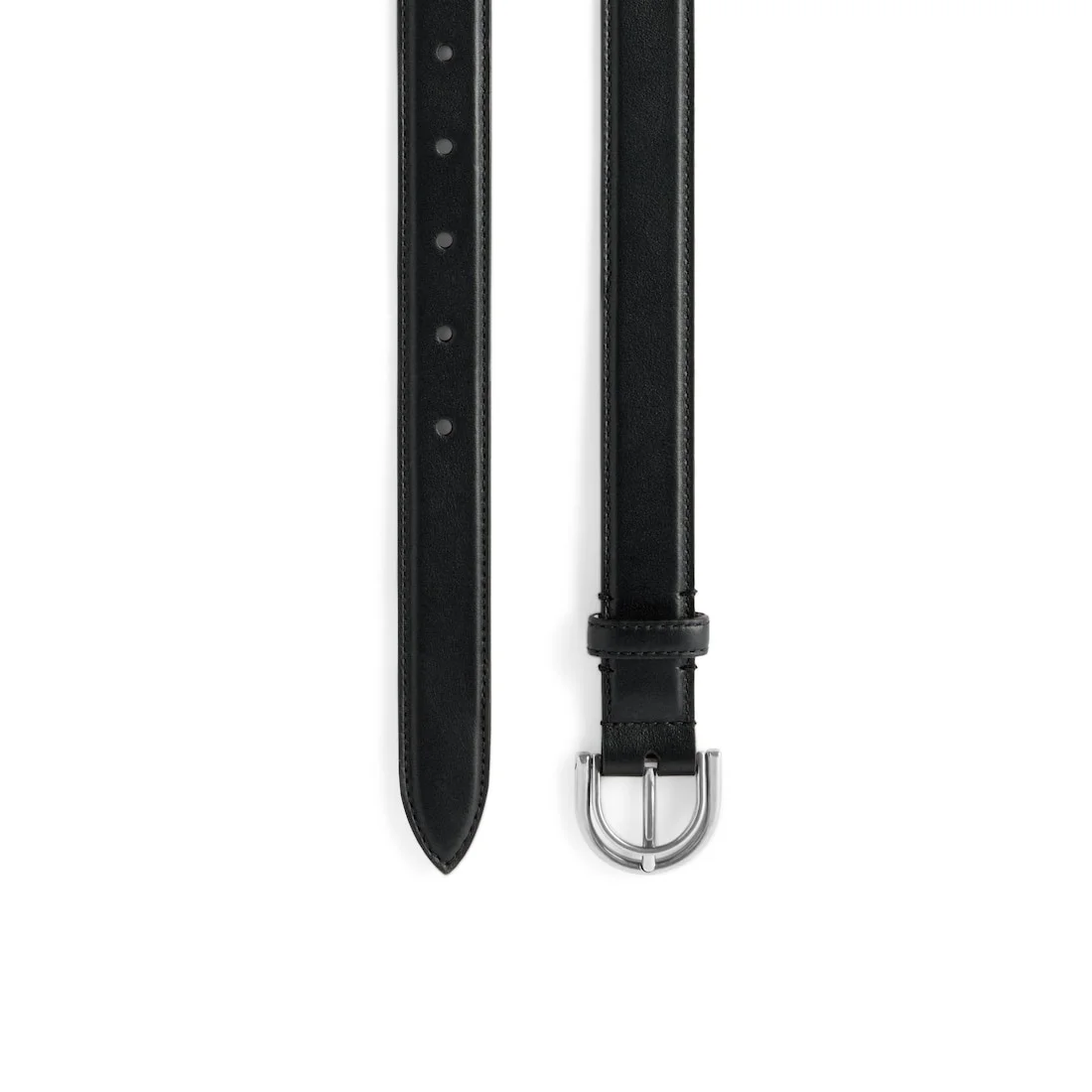 Rodeo Belt in black smooth calfskin, aged-silver hardware PRODUCT DETAILS • Dimensions: Width: 1 inch • Smooth calfskin • Buckle closure • Aged-silver hardware • 5 notches on the belt • Tone-on-tone leather loop • Made in Italy Material: calfskin
