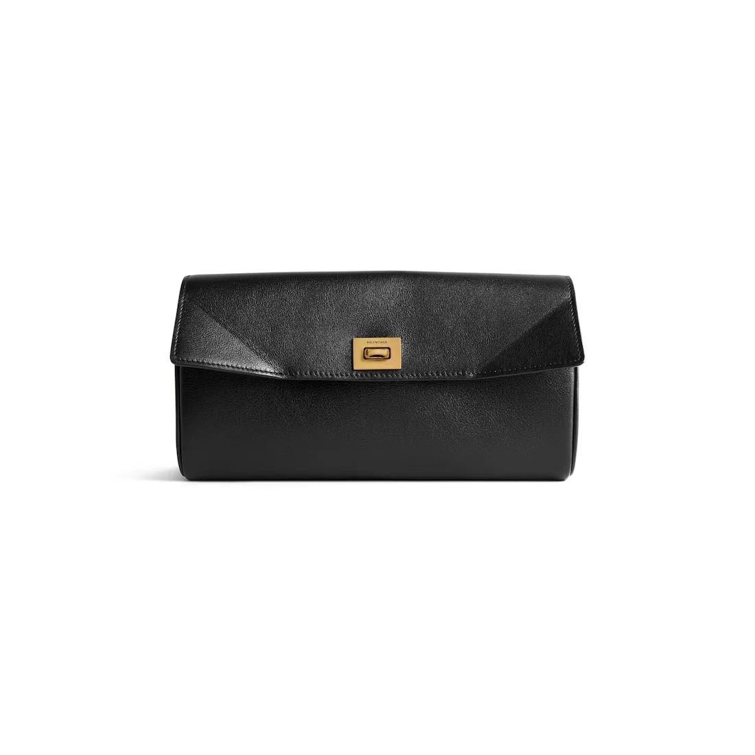 Rodeo Continental Wallet in black smooth calfskin, aged-gold hardware PRODUCT DETAILS • Dimensions: L7,9 x H4,3 x W0,4 inch • Smooth calfskin • Continental wallet • Balenciaga logo engraved on the closure system • Aged-gold hardware • 6 inner card slots • 1 inner flat pocket • 1 zipped pocket at back • Side snaps • Made in Italy Material: calfskin