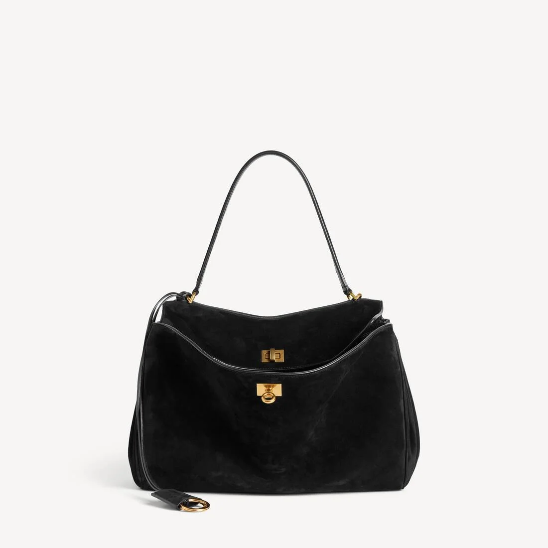 Rodeo Handbag Medium in black suede calfskin and smooth calfskin, aged-gold hardware PRODUCT DETAILS • Suede calfskin and smooth calfskin • Handbag • One handle • Removable shoulder strap • Removable cloche cles with two split rings • Aged-gold hardware • Turn lock closure • Wide front pocket • 1 main compartment • 1 inner zipped pocket • 2 flat pockets at back • Side snaps • 4 brass feet • Nappa lambskin lining • Made in Italy Material: calfskin
