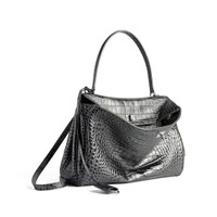 Rodeo Handbag Medium in gunmetal metallized crocodile embossed calfskin, aged-silver hardware PRODUCT DETAILS • Dimensions: L13,8 x H9,2 x W4,3 inch • Metallized crocodile embossed calfskin • Handbag • One handle (drop: 8,1 inch) • Removable shoulder strap (drop: 22,6 inch) • Removable cloche cles with two split rings • Aged-silver hardware • Turn lock closure • Wide front pocket • 1 main compartment • 1 inner zipped pocket • 2 flat pockets at back • Side snaps • 4 brass feet • Nappa lambskin lining • Made in Italy Material: calfskin