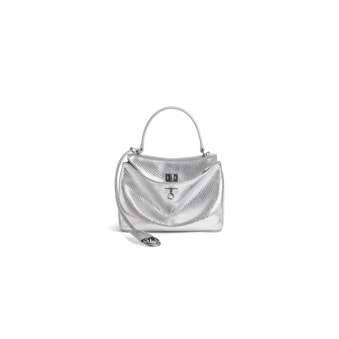 Rodeo Handbag Mini in silver shiny python embossed calfskin, aged-silver hardware PRODUCT DETAILS • Dimensions: L9 x H6,7 x W3,9 inch • Shiny python embossed calfskin • Handbag • One handle hand carry (drop: 4,7 inch) • Removable crossbody strap (drop: 27,2 inch) • Removable cloche cles with two split rings • Aged-silver hardware • Turn lock closure • Wide front pocket • 1 main compartment • 2 flat pockets at back • Side snaps • 4 brass feet • Nappa lambskin lining • Made in Italy Material: calfskin