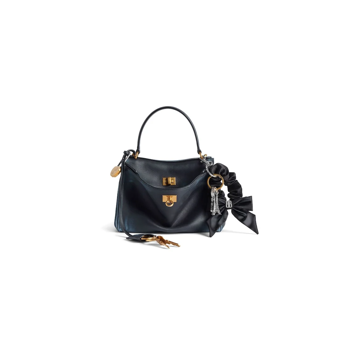 Rodeo Handbag Mini in marine blue used smooth calfskin with charms, aged-gold hardware PRODUCT DETAILS • Dimensions: L9 x H6,7 x W3,9 inch • Used smooth calfskin with charms • Handbag • One handle hand carry (drop: 4,7 inch) • Removable crossbody strap (drop: 27,2 inch) • Removable cloche cles with two split rings • Aged-gold hardware • Turn lock closure • Wide front pocket • 1 main compartment • 2 flat pockets at back • Side snaps • 4 brass feet • Nappa lambskin lining • Made in Italy Material: calfskin, brass