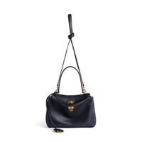 Rodeo Handbag Small in marine blue used smooth calfskin, aged-gold hardware PRODUCT DETAILS • Dimensions: L11,4 x H7,9 x W3,9 inch • Used smooth calfskin • Handbag • One handle (drop: 7,3 inch) • Removable shoulder strap (drop: 22,2 inch) • Removable cloche cles with two split rings • Aged-gold hardware • Turn lock closure • Wide front pocket • 1 main compartment • 1 inner zipped pocket • 2 flat pockets at back • Side snaps • 4 brass feet • Nappa lambskin lining • Made in Italy Material: calfskin