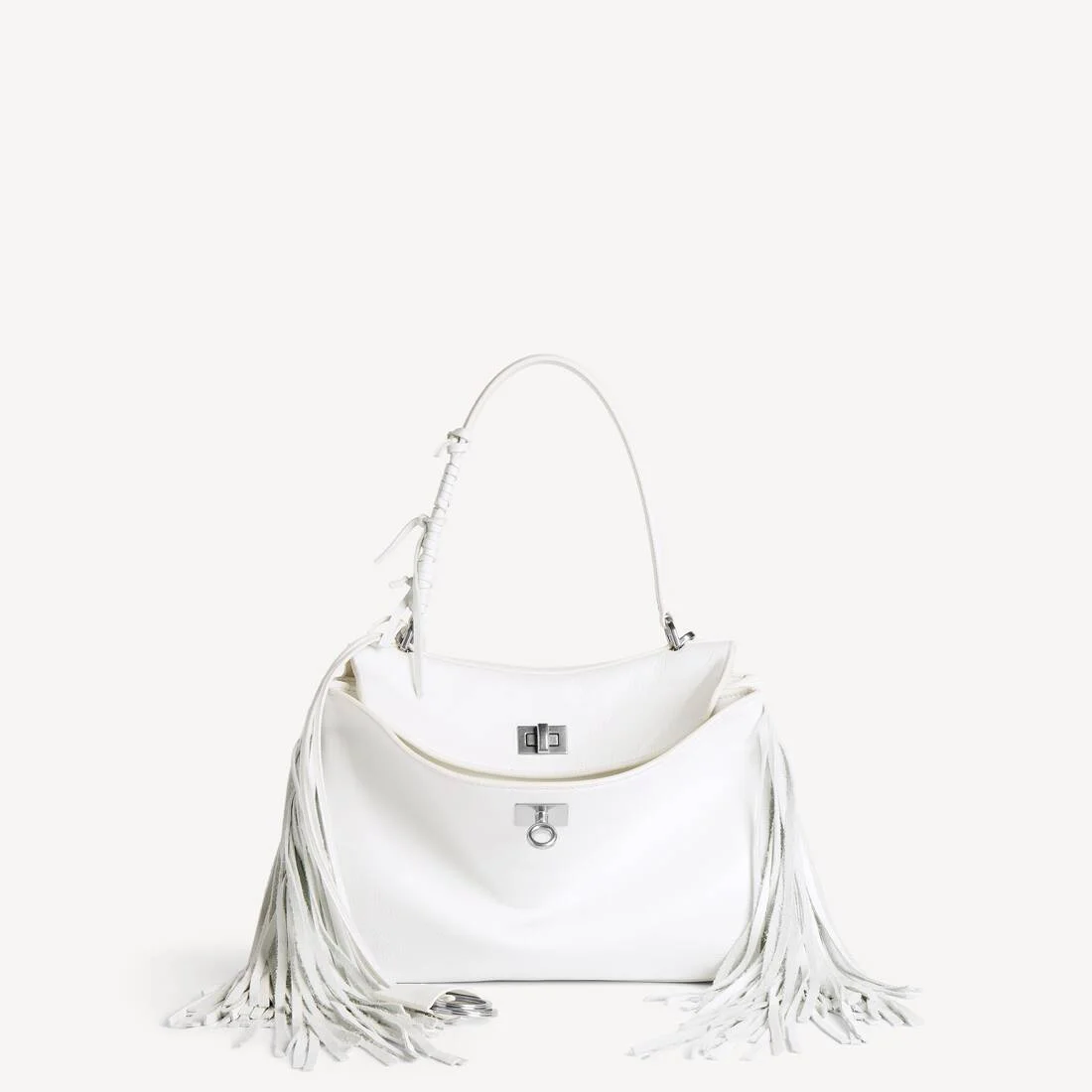 Rodeo Handbag Small in white calfskin with fringes, aged-silver hardware PRODUCT DETAILS • Smooth calfskin with fringes • Handbag • One handle • Knotted fringe detail around the handle • Removable shoulder strap • Removable cloche cles with two split rings • Aged-silver hardware • Turn lock closure • Wide front pocket • 1 main compartment • 1 inner zipped pocket • 2 flat pockets at back • Side snaps • 4 brass feet • Nappa lambskin lining • Made in Italy Material: calfskin