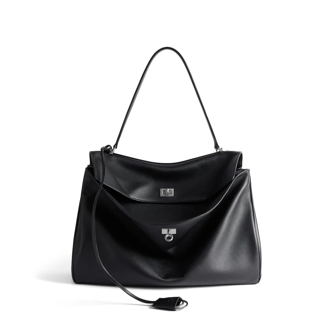 Rodeo Large Handbag in black smooth calfskin, aged-silver hardware PRODUCT DETAILS • Dimensions: L15,7 x H11,8 x W5,1 inch • Smooth calfskin • Handbag • One handle (drop: 9 inch) • Removable shoulder strap (drop: 22,4 inch) • Removable leather key holder with two split rings • Aged-silver hardware • Turn lock closure • Wide front pocket • 1 main compartment • 1 inner zipped pocket • 2 flat pockets at back • Side snaps • 4 brass feet • Nappa lambskin lining • Made in Italy Material: calfskin