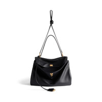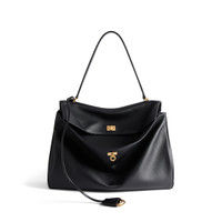 Rodeo Large Handbag in black smooth calfskin, aged-gold hardware PRODUCT DETAILS • Dimensions: L15,7 x H11,8 x W5,1 inch • Smooth calfskin • Handbag • One handle (drop: 9 inch) • Removable shoulder strap (drop: 22,4 inch) • Removable leather key holder with two split rings • Aged-gold hardware • Turn lock closure • Wide front pocket • 1 main compartment • 1 inner zipped pocket • 2 flat pockets at back • Side snaps • 4 brass feet • Nappa lambskin lining • Made in Italy Material: 100% calfskin