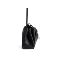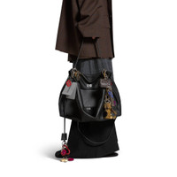 Rodeo Large Handbag in black used smooth calfskin with charms with aged-silver hardware is in several looks of Balenciaga Summer 24 Collection. PRODUCT DETAILS • Dimensions: L15,7 x H11,8 x W5,1 inch • Used smooth calfskin with charms • Handbag • One handle (drop: 9 inch) • Removable shoulder strap (drop: 22,4 inch) • Removable leather key holder with two split rings • Aged-silver hardware • Turn lock closure • Wide front pocket • 1 main compartment • 1 inner zipped pocket • 2 flat pockets at back • Side snaps • 4 brass feet • Nappa lambskin lining • Made in Italy Material: 100% calfskin