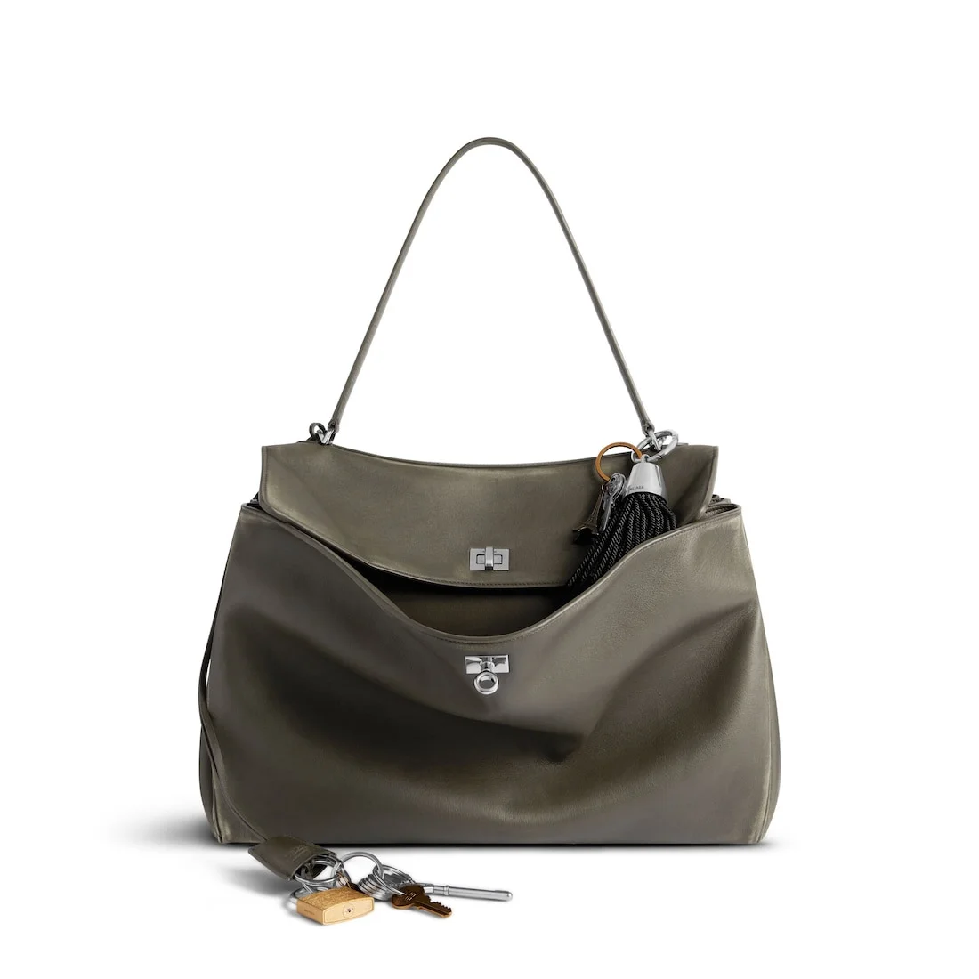 Rodeo Large Handbag in dark green used smooth calfskin with charms, aged-silver hardware PRODUCT DETAILS • Dimensions: L15,7 x H11,8 x W5,1 inch • Used smooth calfskin with charms • Handbag • One handle (drop: 9 inch) • Removable shoulder strap (drop: 22,4 inch) • Removable leather key holder with two split rings • Aged-silver hardware • Turn lock closure • Wide front pocket • 1 main compartment • 1 inner zipped pocket • 2 flat pockets at back • Side snaps • 4 brass feet • Nappa lambskin lining • Made in Italy Material: calfskin, brass, steel, acetate