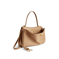 Rodeo Medium Handbag in latte smooth calfskin, aged-gold hardware PRODUCT DETAILS • Dimensions: L13,8 x H9,2 x W4,3 inch • Smooth calfskin • Handbag • One handle (drop: 8,1 inch) • Removable shoulder strap (drop: 22,6 inch) • Removable leather key holder with two split rings • Aged-gold hardware • Turn lock closure • Wide front pocket • 1 main compartment • 1 inner zipped pocket • 2 flat pockets at back • Side snaps • 4 brass feet • Nappa lambskin lining • Made in Italy • The on-model image is solely indicative of the bag size and does not represent the actual model (different color/material). calfskin