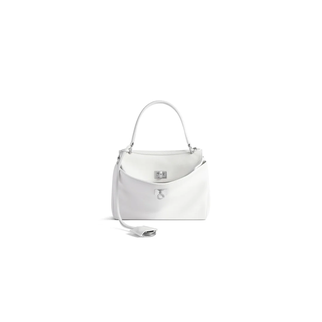 Rodeo Mini Handbag in white smooth calfskin, aged-silver hardware PRODUCT DETAILS • Dimensions: L9 x H3,9 x W3,3 inch • Smooth calfskin • Handbag • One handle hand carry (drop: 4,7 inch) • Removable crossbody strap (drop: 27,2 inch) • Removable leather key holder with two split rings • Aged-silver hardware • Turn lock closure • Wide front pocket • 1 main compartment • 2 flat pockets at back • Side snaps • 4 brass feet • Nappa lambskin lining • Made in Italy Material: calfskin