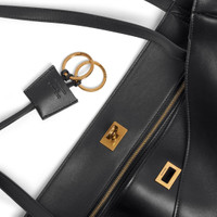 Rodeo Tote Bag in black smooth calfskin, aged-gold hardware PRODUCT DETAILS • Dimensions: L18,5 x H11,8 x W8,6 inch • Smooth calfskin • Tote bag • Two handles (drop: 11,4 inch) • Removable cloche cle with two split rings • Aged-gold hardware • Turn lock closure • Wide front pocket • 1 main compartment • 1 inner zipped pocket • 2 flat pockets at back • Side snaps • 4 brass feet • Nappa lambskin lining • Made in Italy Material: calfskin