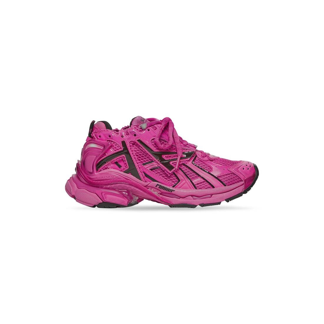 Runner Sneaker in dark pink and black mesh and nylon PRODUCT DETAILS • Leather free • Sneaker • Mesh and nylon • Worn-out effect • Printed size at the edge of the toe • Embossed size at back • Runner logo printed on exterior • Balenciaga logo embroidered on the tongue • Balenciaga logo at the back of the heel • Back pull-on tab • Made in China • Wipe with a soft cloth Material: 65% polyurethane, 35% polyester