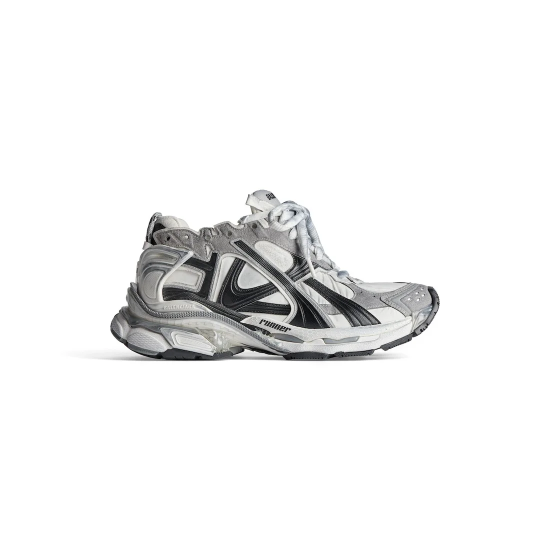 Runner Sneaker in grey, white and black nylon and suede-like fabric PRODUCT DETAILS • Leather free • Sneaker • Nylon and suede-like fabric • Worn-out effect • Printed size at the edge of the toe • Embossed size at back • Runner logo printed on exterior • Balenciaga logo embroidered on the tongue • Balenciaga logo at the back of the heel • Back pull-on tab • Made in China • Wipe with a soft cloth Material: 57% polyurethane, 43% polyester
