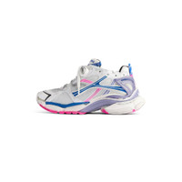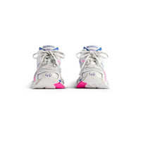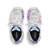 Runner Sneaker in white, lilac, neon pink and navy mesh, polyurethane and polyester PRODUCT DETAILS • Leather free • Sneaker • Mesh, polyurethane and polyester • Worn-out effect • Printed size at the edge of the toe • Debossed size at back • Runner logo printed on exterior • Balenciaga logo embroidered on the tongue • Balenciaga logo at the back of the heel • Back pull-on tab • Made in China Upper: polyurethane, polyester - Sole: rubber, TPU, EVA, polyurethane - Insole: foam
