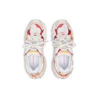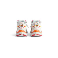 Runner Sneaker in white, orange, pink and red polyurethane and polyester PRODUCT DETAILS • Leather free • Sneaker • Polyurethane and polyester • Worn-out effect • Printed size at the edge of the toe • Debossed size at back • Runner logo printed on exterior • Balenciaga logo embroidered on the tongue • Balenciaga logo at the back of the heel • Back pull-on tab • Made in China Upper: polyurethane, polyester - Sole: rubber, TPU, EVA, polyurethane - Insole: polyester