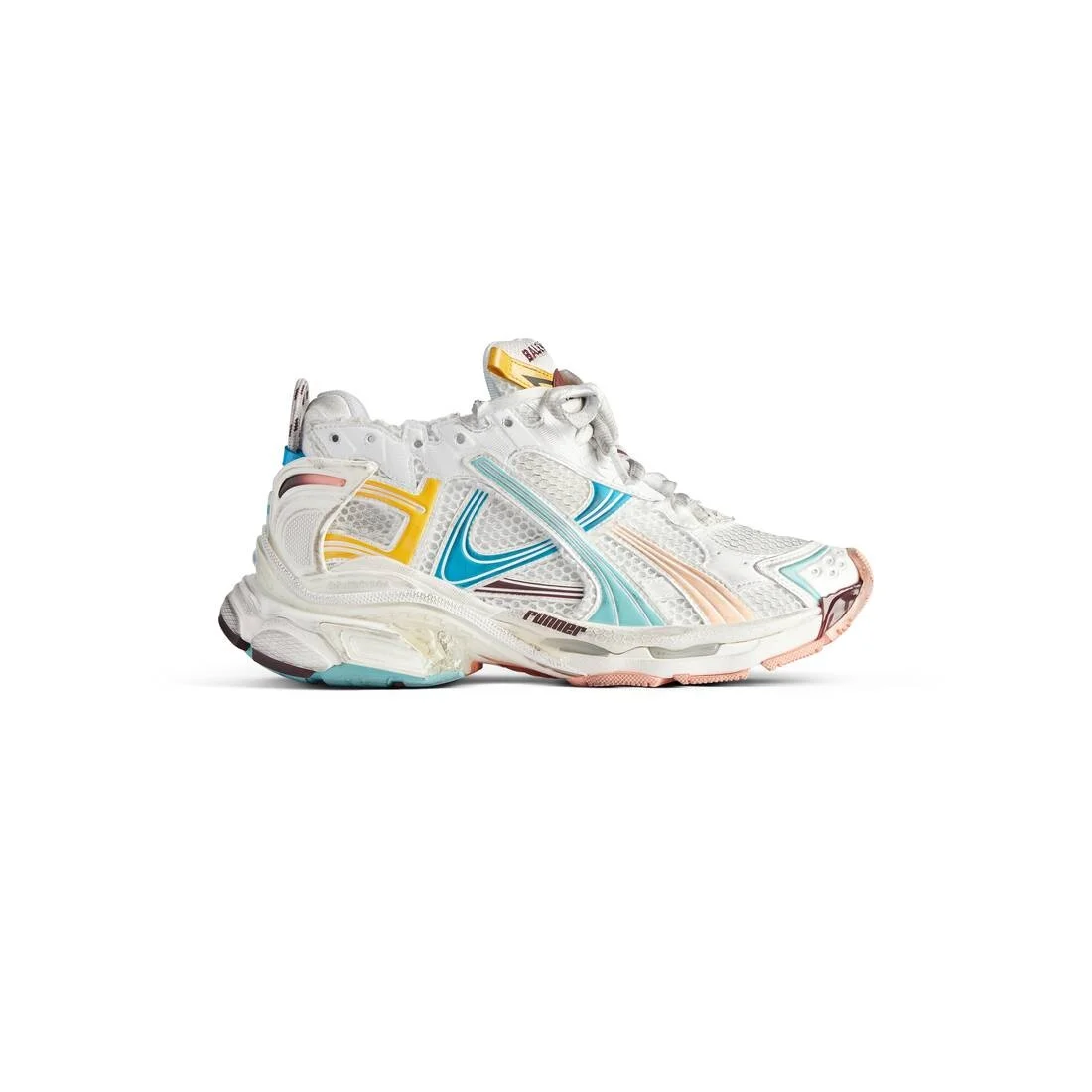 Runner Sneaker in white, yellow, pink and blue mesh and nylon PRODUCT DETAILS • Leather free • Sneaker • Mesh and nylon • Worn-out effect • Printed size at the edge of the toe • Debossed size at back • Runner logo printed on exterior • Balenciaga logo embroidered on the tongue • Balenciaga logo at the back of the heel • Back pull-on tab • Made in China Material: polyurethane, polyester