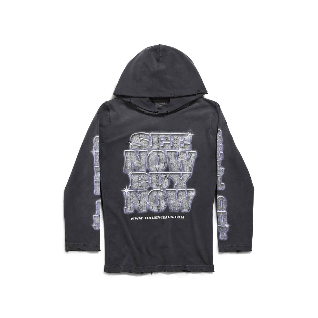 SNBN Long Sleeve Hooded T-Shirt Fitted in black peeling stretch jersey is from look 68 of Balenciaga Summer 24 Collection. PRODUCT DETAILS • Peeling stretch jersey • This item is unisex • Fitted • Inset hood • Long sleeves • SNBN artwork printed at front, back and sleeves • Cracked effect artwork • Destroyed and washed-out effect • Made in Portugal • Dry cleaning Material: 94% cotton, 6% elastane