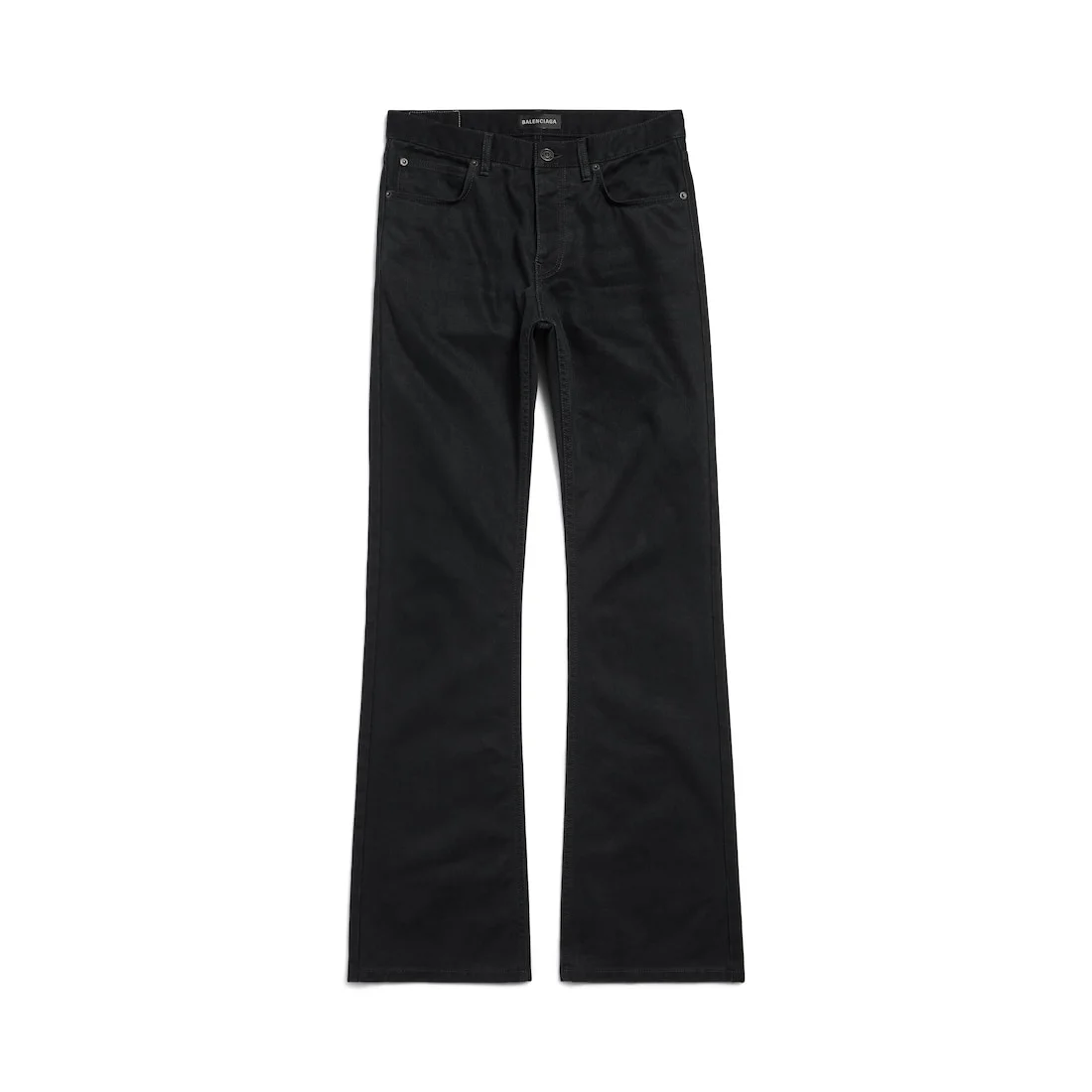 Straight Fit Pants in black soft Italian denim PRODUCT DETAILS • Soft Italian ring denim • Mid-waist • Covered button fly • 5 belt loops • 5 pockets • Balenciaga engraved flex buttons • Balenciaga patch at back • Made in Japan Main material: 100% cotton