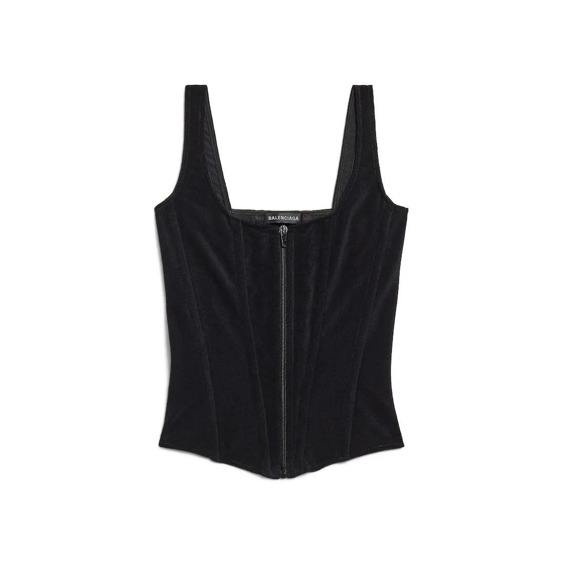 Stretch Corset Top in black active velvet for Women PRODUCT DETAILS • Velvet • Front zipper • Corset construction • Underwired front and back • Rounded neckline • Tank straps • Made in Italy Main material: 80% cotton, 20% polyester