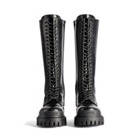 Strike 20mm Boot in black matte smooth calfskin PRODUCT DETAILS • Matte smooth calfskin • Boot • Extra round toe • 20mm arch • Tone-on-tone laces • Inner zipped closure • Visible tone-on-tone top-stitching • 24 eyelets lace-up vamp • Thick toothed rubber outsole with Balenciaga logo in the front and in the back • Loop at back • Made in Italy • Wipe with a soft cloth Material: 100% calfskin
