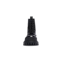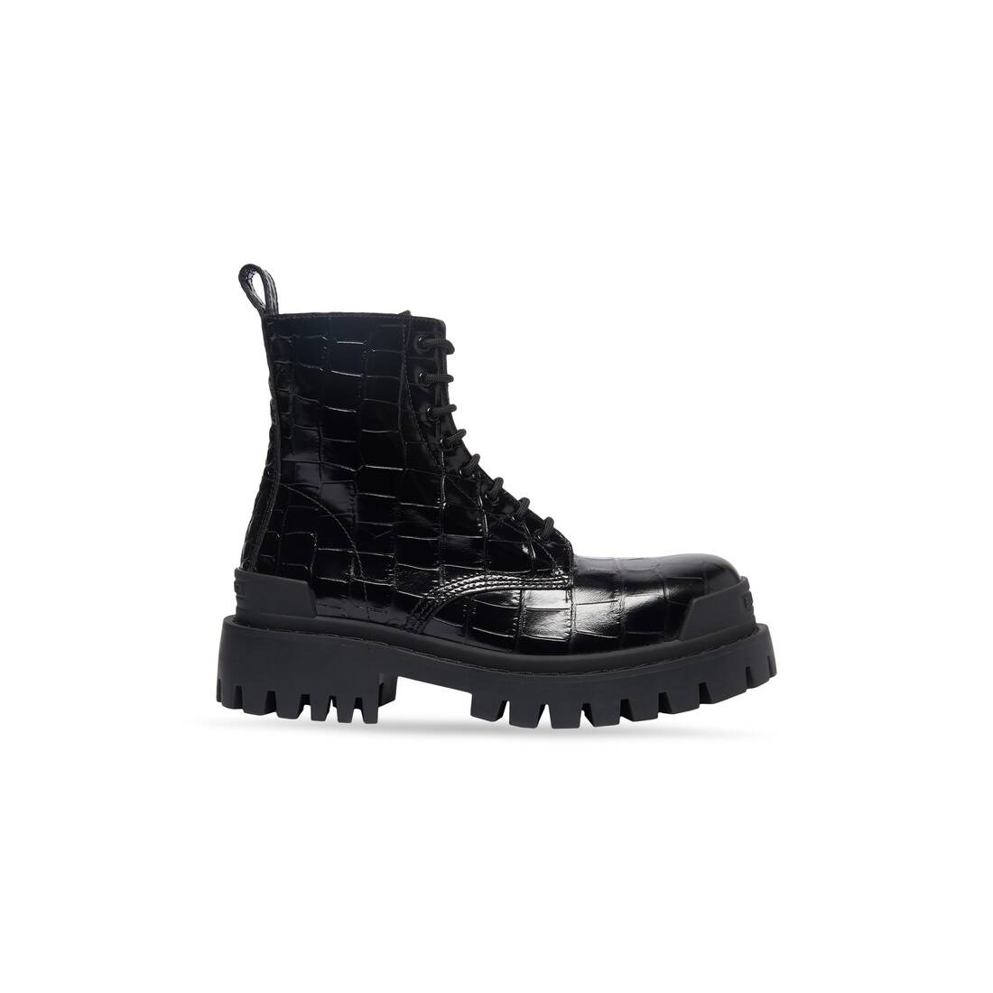 Strike 20mm Lace-up Boot in black crocodile embossed calfskin PRODUCT DETAILS • Smooth mat calfskin • Extra round toe • 20mm arch • Mid-calf height • Tone-on-tone laces • Visible tone-on-tone top-stitching • 8 eyelets lace-up vamp • Thick toothed rubber outsole • Loop at back • Made in Italy • Wipe with a soft cloth Material: 100% calfskin