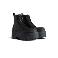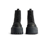 Strike Platform Bootie in black soft bullskin PRODUCT DETAILS • Soft bullskin • Bootie • Extra round toe • Worn-out effect • 80mm platform height • 8 eyelets lace-up vamp • BB logo embossed on the back of the heel • Thick toothed rubber outsole • Made in Italy Upper: bullskin - Sole: TPU - Insole: calfskin