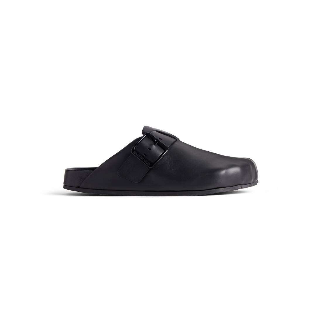 Sunday Mule in black matte calfskin is from the look 19 of Balenciaga’s Spring 24 Collection. PRODUCT DETAILS • Matte calfskin • Mule • Five finger shape at toe • One leather strap with one adjustable belt buckle • Balenciaga logo engraved on buckle • Printed Balenciaga logo on sole part • Tone-on-tone sole and insole • Made in Italy • Wipe with a soft cloth Material: 100% calfskin